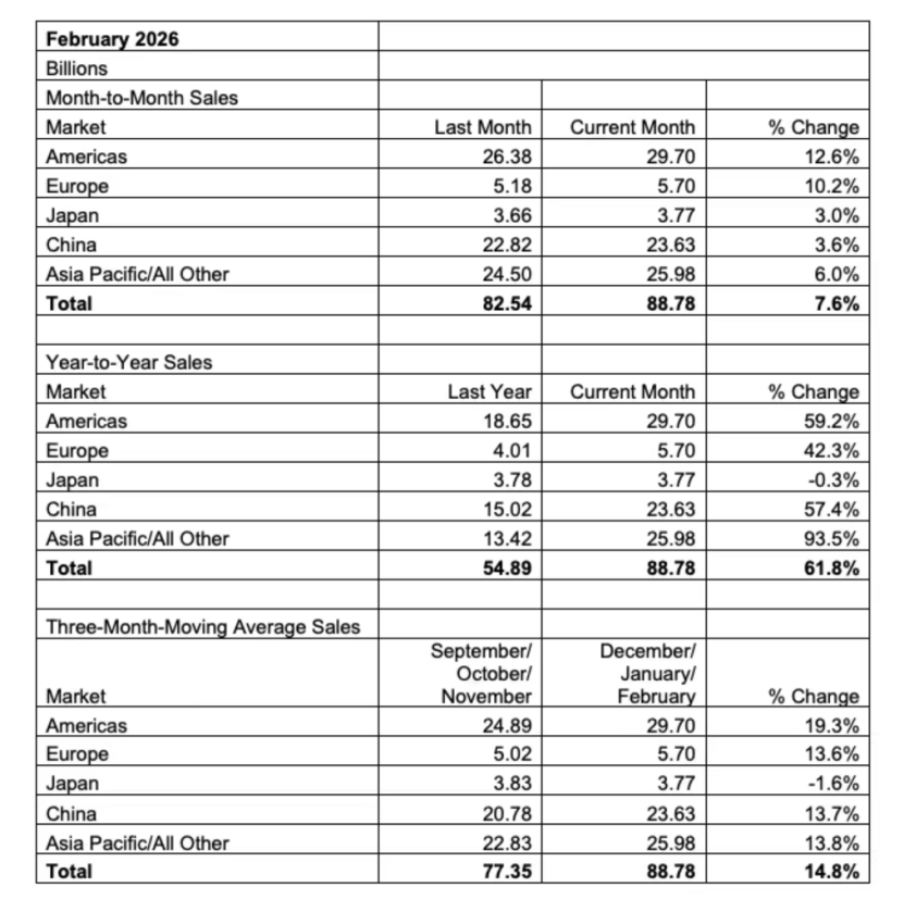 半导体行业协会(SIA)4月6日公布数据显示,2026年2月全球半导体销售额达888亿美元,环比增长7.6%,同比暴增61.8%。从区域来看,亚太/其他地区同比增幅最高达93.5%,美洲增长59.2%,中国增长57.4%,欧洲增长42.3%,日本微跌0.3%。SIA总裁兼CEO John Neuffer表示,亚太、美洲和中国市场是年度增长的主要驱动因素,预计全年销售额将逼近1万亿美元大关。